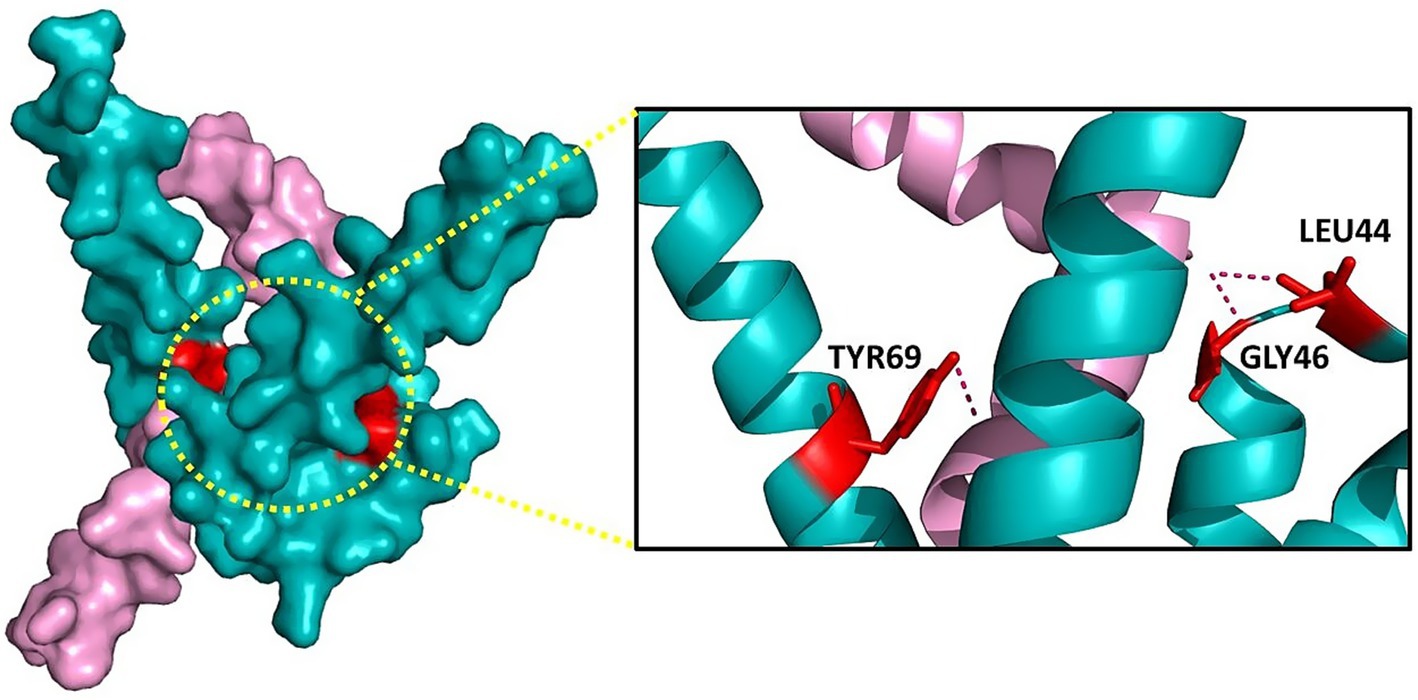Figure 4. Molecular interaction interface between Aβ42 (cyan) and ADNP7 (pink). Left: Surface representation of the complex, with the binding interface highlighted by a yellow dotted circle. Right: Zoomed-in view showing key interacting residues from ADNP7- TYR69, GLY46, and LEU44, forming hydrogen bonds (dashed lines) and hydrophobic contacts with Aβ42. Residues are shown as sticks for clarity.