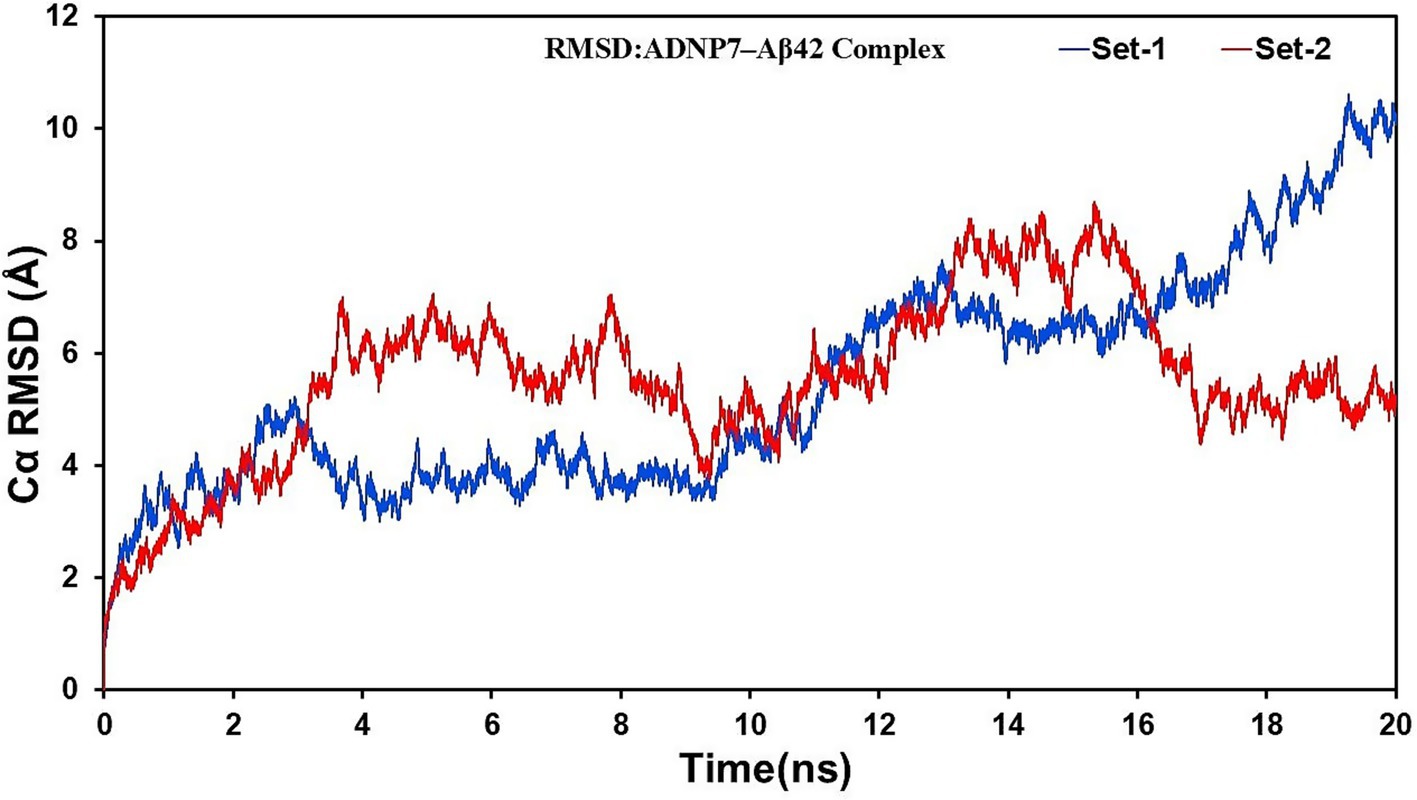 Figure 5. Backbone RMSD of the ADNP7–Aβ42 complex over 20 ns of molecular dynamics simulation. RMSD values (Å) are plotted for two independent replicates (Set-1 in blue, Set-2 in red), indicating structural stabilization after initial relaxation.