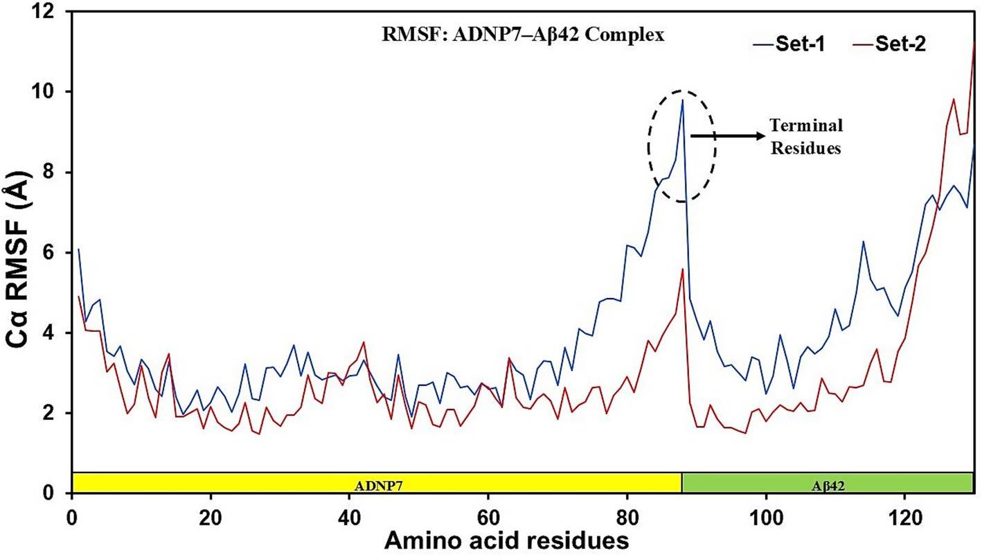 Figure 6. Per-residue root mean square fluctuation (RMSF) of the ADNP7–Aβ42 complex. RMSF values (Å) are shown for all Cα atoms across the 20 ns trajectory for Set-1 (blue) and Set-2 (red). The ADNP7 segment (residues 1–88, yellow highlight) exhibits lower flexibility than the Aβ42 segment (residues 89–130, green highlight).