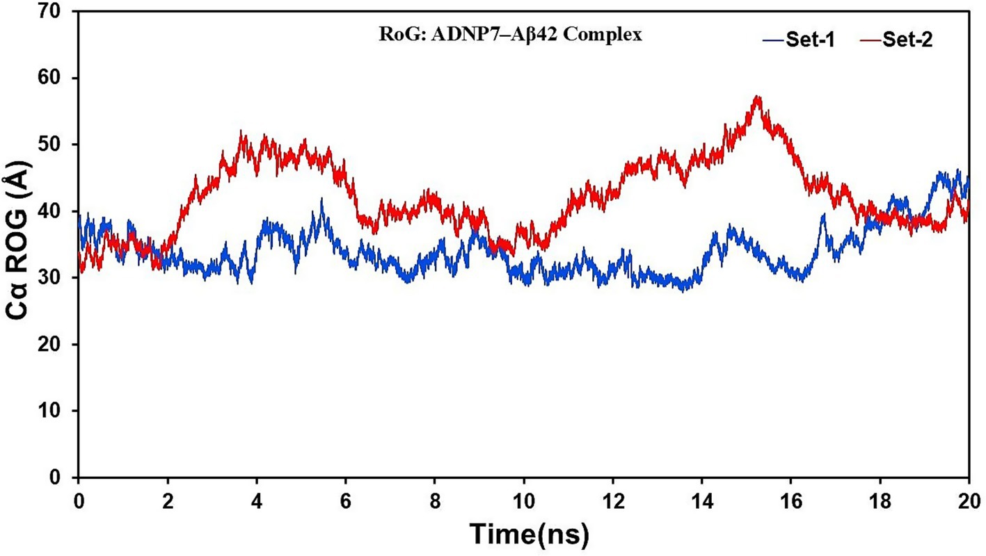 Figure 7. Radius of Gyration (Rg) of the ADNP7–Aβ42 complex during MD simulation. Rg (Å) is plotted over time (ns) for Set-1 (blue) and Set-2 (red), reflecting consistent overall compactness with minor transient expansions.