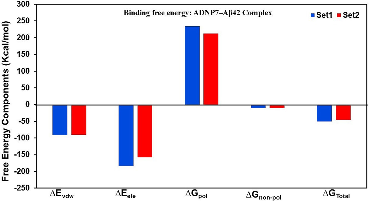 Figure 8. MM/PBSA binding free energy decomposition for the ADNP7-Aβ42 complex. Contributions from van der Waals (∆Evdw), electrostatic (∆Eele), polar solvation (∆Gpol), and non-polar solvation (∆Gnon-pol) terms are shown for Set-1 (blue) and Set-2 (red).