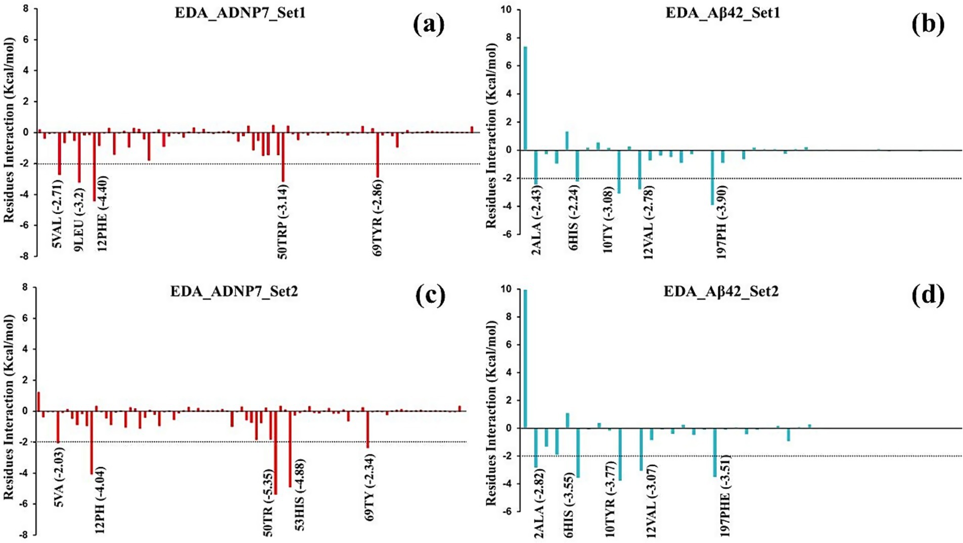 Figure 9. Per-residue energy decomposition analysis (EDA) of the ADNP7-Aβ42 interface. (a,c) Energetic contributions of ADNP7 residues in Set-1 and Set-2, respectively. (b,d) Corresponding contributions from Aβ42 residues. Negative values indicate favorable binding; key hotspots include: PHE12, TRP50 (ADNP7), and TYR10, PHE197 (Aβ42).