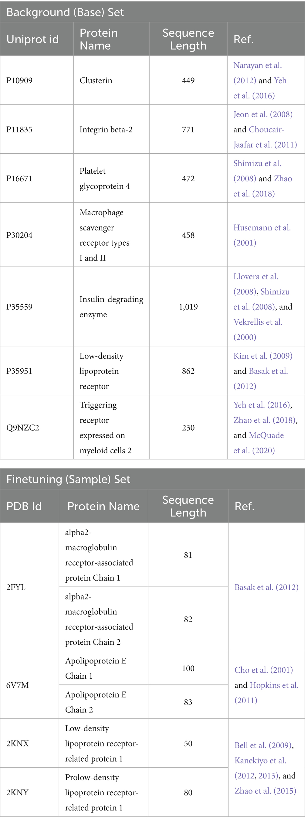 Table 1. Summary of protein sequences used for model training and fine-tuning, including UniProt/PDB IDs, sequence lengths, and literature references.