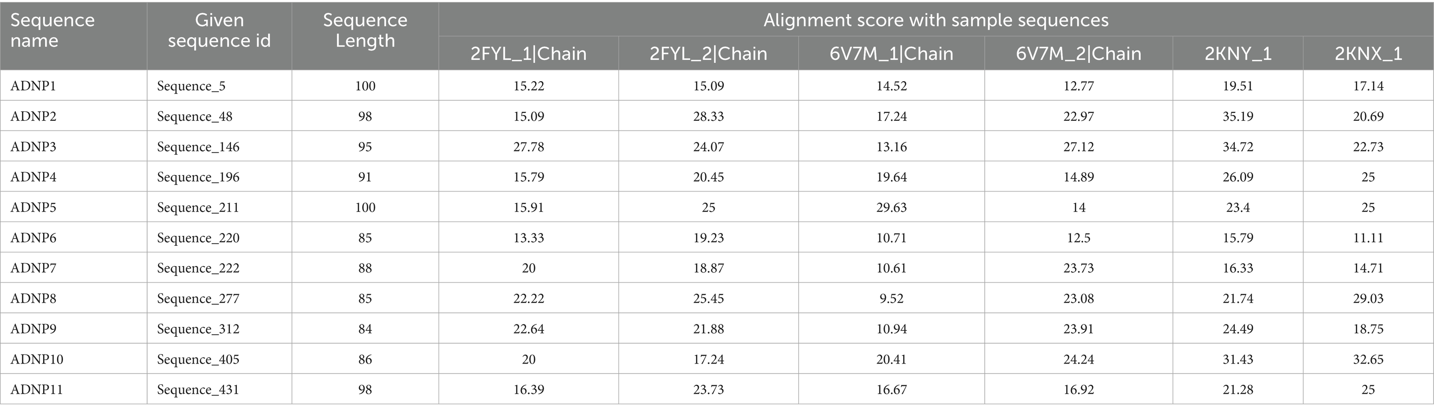 Table 2. Sequence identity and alignment scores of 11 shortlisted ADNP peptides with six reference proteins used in fine-tuning.