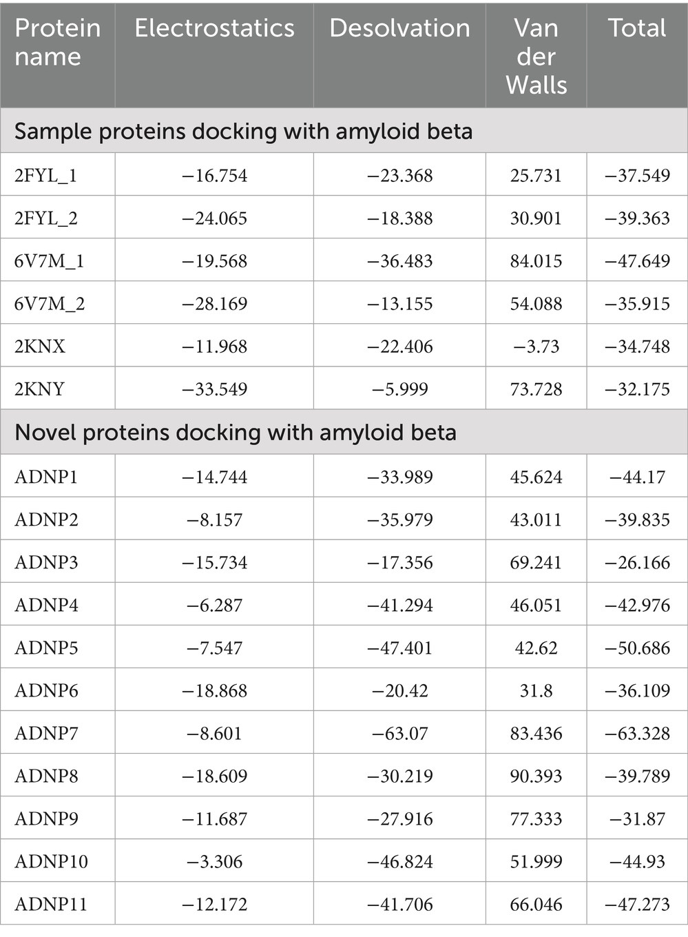 To assess the structural plausibility and amyloid-beta (Aβ) binding potential of the shortlisted peptides, 3D structural modeling followed by protein–protein docking was performed. The 11 peptides selected after biophysical screening and sequence similarity analysis were named as Amyloid-Degrading Novel Peptide (ADNP1–ADNP11) and were structurally modeled using the AlphaFold server (Jumper et al., 2021). Structural visualization and verification were carried out using Jmol to ensure correct folding, absence of steric clashes, and suitability for docking (Herráez, 2006). Protein–protein docking was performed using pyDockWEB, a rigid-body docking server that incorporates electrostatics, desolvation, and van der Waals scoring (Jiménez-García et al., 2013). Each modeled peptide structure was docked against the Aβ42 monomer structure retrieved from the Protein Data Bank (PDB ID: 1IYT) (Crescenzi et al., 2002). The docking protocol evaluated multiple energy-based scoring components, including electrostatic energy, desolvation energy, van der Waals energy, and total binding energy. ADNP peptides demonstrating more negative total docking scores were interpreted to have higher binding affinities toward Aβ. Particular emphasis was placed on peptides exhibiting favorable van der Waals and desolvation scores, as these indicate better surface complementarity and solvent compatibility, both of which are crucial for stable and specific protein–protein interactions.