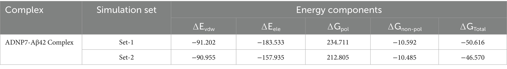 Binding free energy calculations utilizing the MM/PBSA method were conducted on the final 20 ns of both MD simulations to assess the interaction intensity between ADNP7 and Aβ42. The total binding free energy (ΔGTotal) was determined to be significantly negative in both trials, −50.616 kcal/mol (Set1) and −46.570 kcal/mol (Set2) which are mentioned in the Table 4, signifying a stable and energetically advantageous complex. The van der Waals (ΔEvdw) and electrostatic (ΔEele) components were the primary contributors to binding, with values about −90 to −95 kcal/mol and −178 to −198 kcal/mol, respectively, underscoring robust hydrophobic packing and charge interactions. Conversely, the polar solvation energy (ΔGpol) was detrimental (+211 to +225 kcal/mol), indicating the desolvation expense of polar residues. The non-polar solvation energy (ΔGnon-pol) offered negligible beneficial contributions, approximately in the range of −7 kcal/mol. The similarity across both sets suggests that ADNP7 consistently and robustly interacts with Aβ42, mostly because to hydrophobic and electrostatic interactions, notwithstanding solvation penalties (Figure 8).