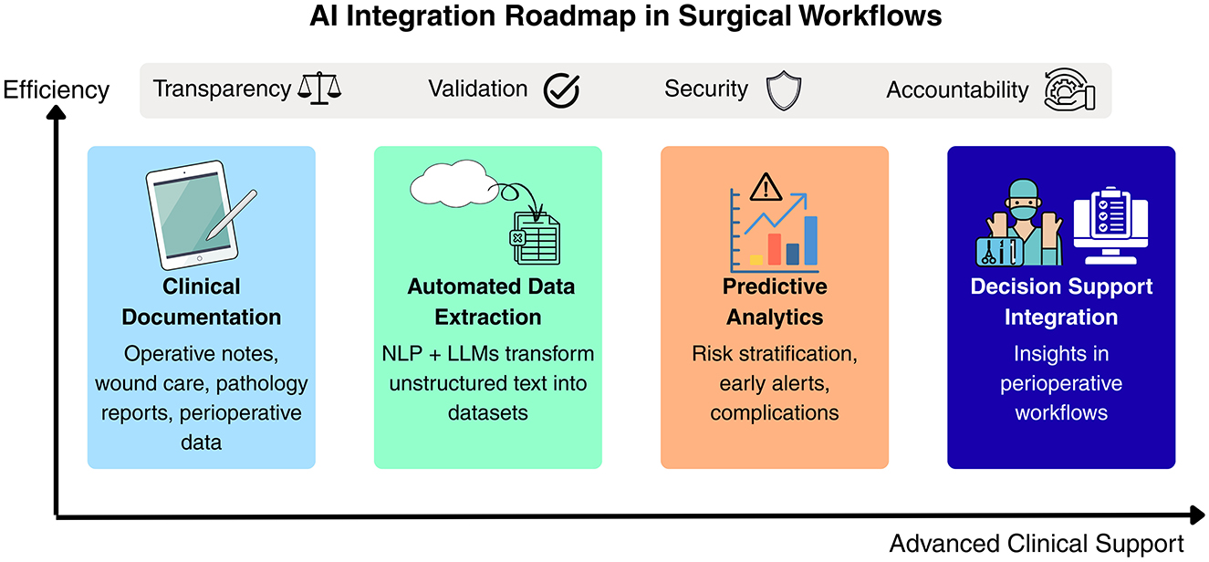 Figure 1 summarizes this staged trajectory, showing a roadmap for integrating intelligent tools into surgical workflows, from initial documentation support toward advanced perioperative decision assistance guided by transparency, validation, security, and accountability.