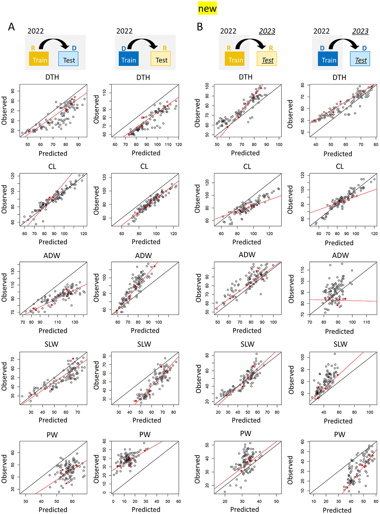 “The calibration also reduced the RMSE values for the prediction of ADW, SLW, and PW (Supplementary Table 14). In terms of type-2 model robustness, calibration reduced the RMSE values for CL, ADW, PW, and DTH (Supplementary Table 15). There were, however, two cases where calibration resulted in a larger RMSE: the prediction of CL under the delayed transplanting protocol (type-1 model robustness) and the prediction of SLW of the delayed protocol in 2023 (type-2 model robustness). In these two cases, the phenotypic data of the four parental cultivars did not cover the full range of phenotypic variance of the JAM2 lines.”