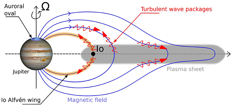 A new and evolving area of turbulence research in the outer planets' magnetosphere are the Alfvén wings generated by the moons. In Figure 1, we exemplarily show Jupiter's moon Io. The moon is an obstacle to the rotating magnetospheric plasma and generates Alfvén waves, which propagate along the rotating background magnetic field toward Jupiter. In the rest frame of each moon two standing waves develop (north and south, respectively). They are referred to as Alfvén wings (Goertz, 1980; Neubauer, 1980, 1998; Saur et al., 2013). The moons can thus be considered as gigantic Alfvén wave antenna. The Alfvén wings are reflected at gradients of the background density and generate filamented structures (Chust et al., 2005; Hess et al., 2011). The magnetic field fluctuations in Io's Alfvén wings at high latitudes have been recently measured by the Juno spacecraft. Their spectrum is consistent with a power law spectral index of –2.35 ± 0.07 within 0.1–800 Hz (Sulaiman et al., 2020). When the filamented waves approach kinetic scales, wave-particle interaction sets in and can energize electrons through electron Landau damping and ions through cyclotron damping (Hess et al., 2010; Saur et al., 2018; Szalay et al., 2018, 2020b). Similar particle acceleration processes have also been observed in the Alfvén wings of Europa (Allegrini et al., 2020) and Ganymede (Szalay et al., 2020a).