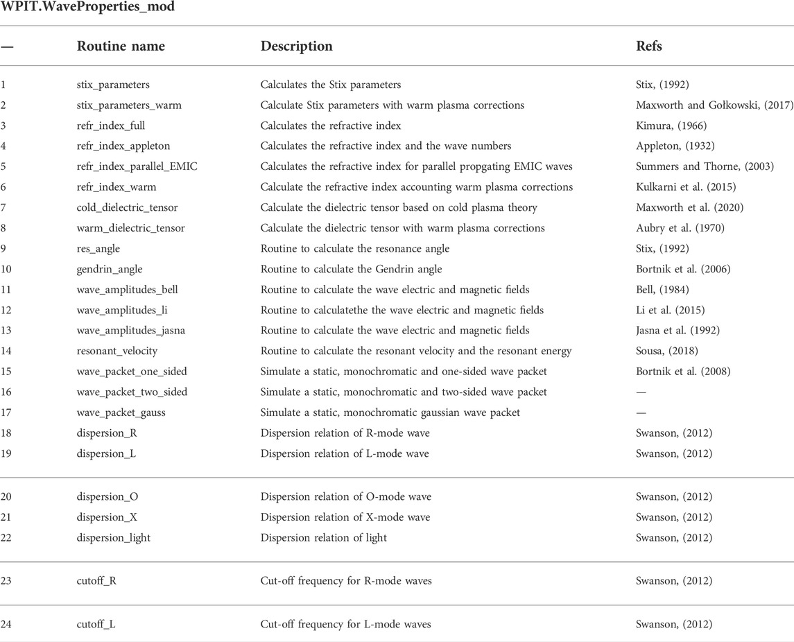 Module WPIT. WaveProperties_mod includes routines for the characterization of wave properties in the magnetosphere. The routines of the module are presented in Table 2. These include estimations of the Stix parameters, the refractive index, the refractive index based on the Appleton-Hartree approximation, the refractive index of parallel propagating EMIC waves and the dielectric tensor according to cold plasma theory. WPIT includes also routines for the calculation of the above parameters accounting for warm plasma corrections, according to Kulkarni et al. (2015) and Maxworth et al. (2020). Furthermore, this module includes routines for the calculation of the resonance cone angle and the Gendrin angle according to Bortnik et al. (2006), wave electric and magnetic component amplitudes based on the formulations of Bell (1984), Jasna et al. (1992) and Li et al. (2015). WPIT includes a routine to calculate the resonant energy of an electron that interacts with a specific wave and routines to define a wave packet. In the current version of WPIT, a wave packet is defined as the latitudinal profile of the wave amplitude, that can be one sided, two sided or Gaussian in shape with respect to magnetic latitude (see, e.g., Figure 3D). For completeness, WPIT includes also, routines for the calculation of the dispersion relation of different types of waves in plasma, including the R-mode, L-mode, O-mode, X-mode and light, as well as the cut off frequencies of R- and L-mode waves (see, e.g., Swanson (2012)). Detailed description of each routine along with example runs can be found in the WaveProperties_mod_description Jupyter notebook, located in the Module_descriptions folder of the WPIT repository.