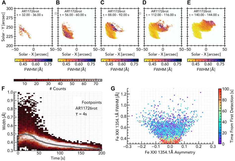 FIGURE 5. Evolution of Fe xxi widths in a RADYN_Arcade model. The top row (A–E) show maps of the line widths at various snapshots, illustrating that the footpoints and lower legs exhibit broader profiles. Taking all these pixels and producing a superposed epoch analysis (F) indicates that in comparison to an observations the line widths are too narrow. Panel (G) further illustrates that the profiles are too narrow, and that larger-than-observed asymmetries appear for some of the broadest profiles (colour represents elapsed time from the first moment that Fe xxi was detected in that pixel). Figure adapted from Kerr et al., 2020. © AAS. Reproduced with permission.