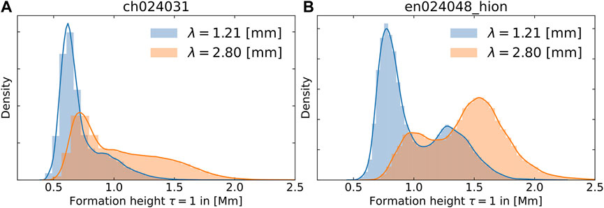 FIGURE 3. Distributions of the heights of optical depth unity [z (τ = 1)] for the two Bifrost models shown in Figure 2 for the continuum at 1.2 mm (blue) and at 2.8 mm (orange): (A) coronal hole and (B) enhanced network region.