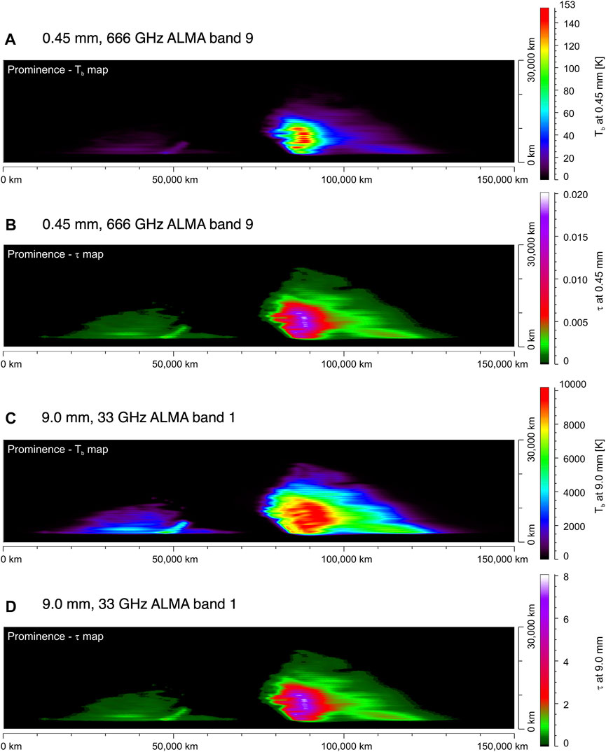 FIGURE 6. Synthetic brightness temperature maps [panels (A, C)] and optical thickness maps [panels (B, D)] showing the 3D whole-prominence fine structure model of Gunár and Mackay (2015) in a prominence view. The top two panels were obtained at a wavelength of 0.45 mm, which corresponds to the 666 GHz ALMA band 9. The bottom two panels were obtained at a wavelength of 9.0 mm (33 GHz ALMA band 1). Displayed color scales are unique for each panel. Adapted from Gunár et al. (2016).