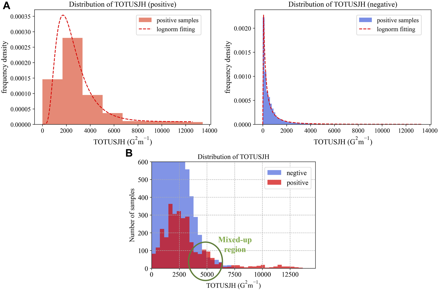 Distribution of the photospheric magnetic parameter (taking TOTUSJH as an example). The Y-axis in (A) represents the frequency density, and the Y-axis in (B) represents the number of samples at different intervals (since the negative samples are far more than the positive samples, the range of Y only considers the positive sample to show the details). The green circular box indicates the mixed-up region of the two types of samples.