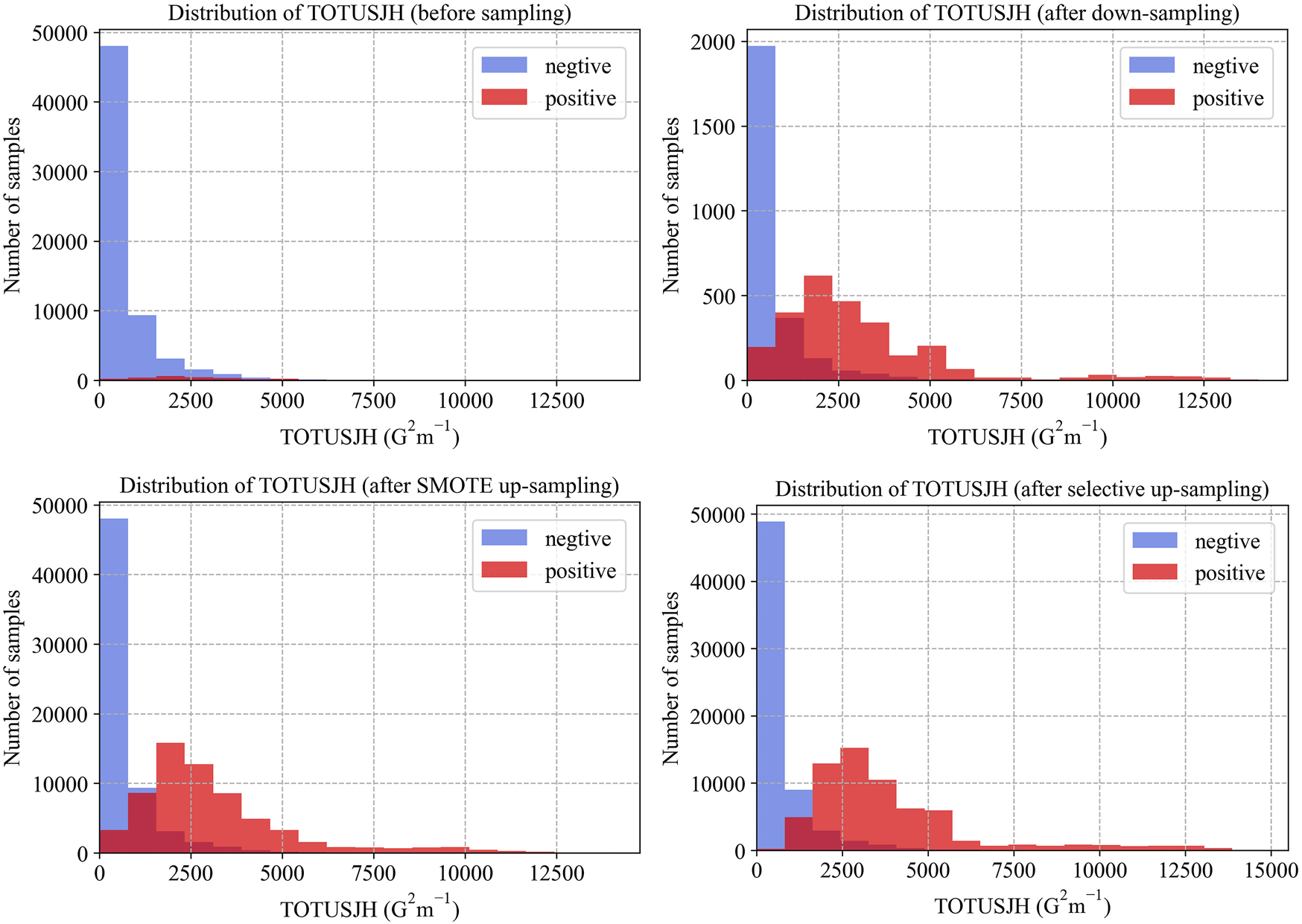 We obtained the parameter distributions before and after resampling, as shown in Figure 5 (we take TOTUSJH as an example). The KL divergence value of strong-flare events before and after sampling was calculated as follows: KL (random down-sampling) = 0; KL (SMOTE up-sampling) = 0.02; and KL (selective up-sampling) = 1.70. It can be seen that the selective up-sampling method has the greatest impact on the parameter distribution of strong-flare events.