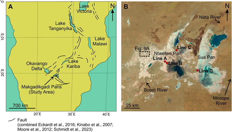 FIGURE 1. The Makgadikgadi Pans (Botswana). (A) Regional map of Southern Africa. Major faults are labeled with bold black lines, the majority of which are associated with the East African Rift (EAR). The Makgadikgadi Pans represent the southernmost termination of the EAR. Modified from Schmidt et al. (2023). (B) Landsat 8 images of the pans from October 2021 (-20.8°, 25.5°). Red circles indicate ERT survey line locations (Lines A, B, C, D).