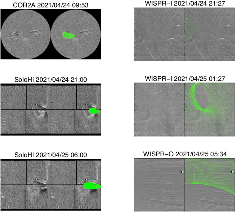 FIGURE 12. Example frames with (right) and without (left) the GCS mesh overlay from COR2, SoloHI, and WISPR-I and WISPR-O. The discrepancies between the GCS model and the observed features in the WISPR frames are due to the Thomson scattering effects.