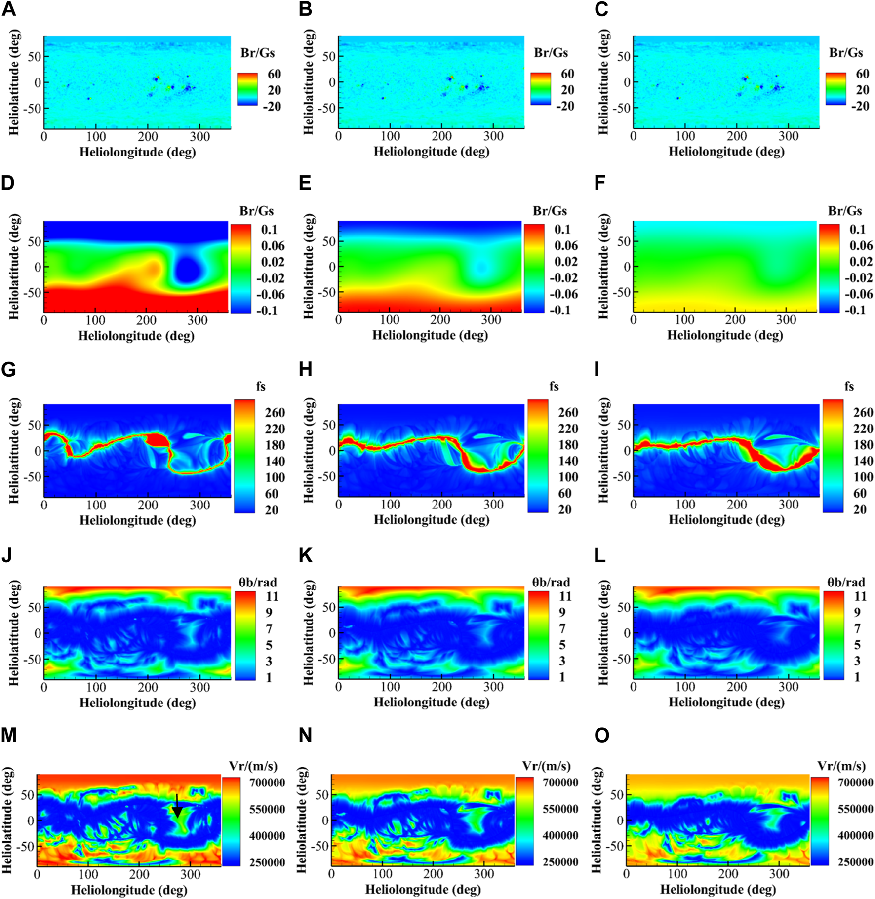 The solar wind parameters for CR2069. The abscissa is the longitude of the heliopause and the vertical coordinate is the latitude. The parameters from the first to fifth rows are the magnetic field Br at 1Rs(A–C), the magnetic field Br at 1Rss(D–F), the coronal magnetic field expansion factor fs(G–I), the minimum angular distance θb from the open magnetic line to the coronal hole (J–L), and the solar wind velocity Vr(M–O), respectively. The first column shows the parameters at Rss = 2Rs(A,D,G,J,M). The second column is the parameters when Rss = 2.5Rs(B,E,H,K,N). And the third column shows the parameters at Rss = 3Rs(C,F,I,L,O).