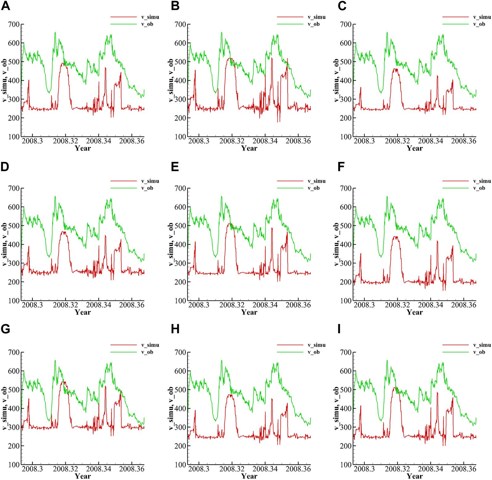 Comparison of the observed data and simulated results for different , , , and when . The horizontal coordinate is time (1/365 Day), and the ordinate is solar wind speed (km/s). The red line is the simulated solar wind speed, and the green line is the observed solar wind speed. (A) Comparison obtained from empirical parameter values with , , , and ; (B) when ; (C) when ; (D) when ; (E) when ; (F) when ; (G) when ; (H) when ; (I) when .