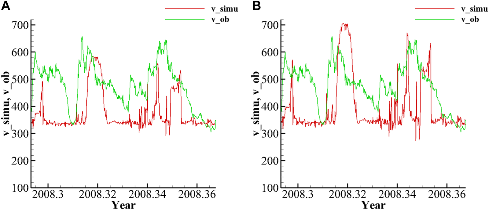 (A) Comparison of the observed solar wind speed with the simulated results with the adjustment of , , , and (A) and then , , , and (B), at .