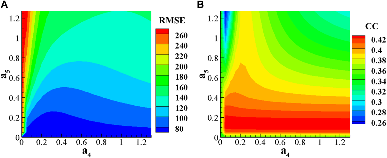 When , the 2D distribution of RMSE for and (A), and the 2D distribution of CC (B).