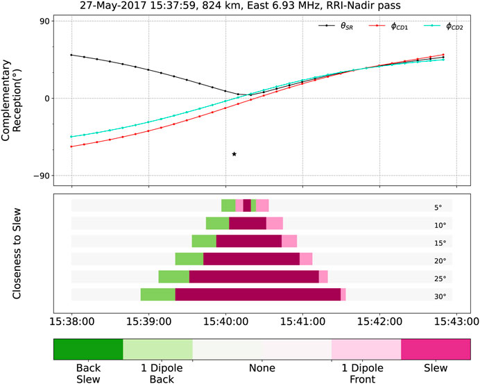 FIGURE 6. Complementary reception angles (top) and closeness to slew for multiple criteria (bottom). θSR is the boresight’s supplementary reception angle (black line), and the ϕCD1 (red line) and the ϕCD2 (cyan line) are the Dipole1 and the Dipole2 complementary reception angles, respectively. In the bottom panel, the dark green color shows that the radio wave was incident on the back face of the antenna, the light green color shows the radio wave was incident on the leading edges of the dipoles (90°–90° + slew criteria) within the slew limits to one dipole axis, the light pink color indicates the radio wave was incident to the end edges of the dipoles (90° ˗slew criteria) within the slew limits to one dipole axis, and lastly, the dark pink color represents the front face slew condition (both dipoles are in the optimum position for the observation). The white color denotes that the RRI was not in an optimum position to observe the radio wave components.