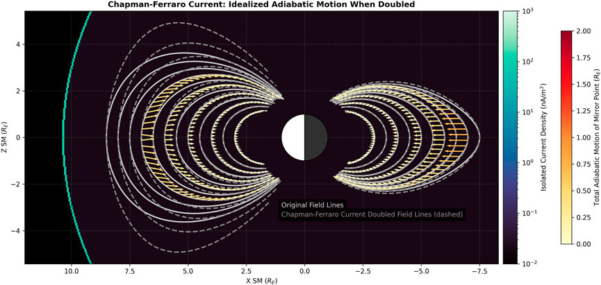 Figure 7. Idealized adiabatic motion when the Chapman-Ferarro current intensity is doubled. The background shows the external field density consisting of just the Chapman-Ferarro source, computed using Eq. 3.