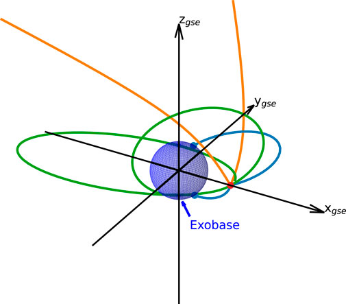 Figure 2. Example trajectories of neutral hydrogen atoms launched from an exospheric point of interest (red point) and traced backward in-time by the MATE neutral hydrogen tracer. The blue and orange lines represent the trajectories of hydrogen atoms originating from the exobase and interplanetary space, while the green lines represent the trajectories of satellite hydrogen atoms. The blue sphere represents the exobase at a 500 km altitude, and the blue points indicate the exobase footprints of the hydrogen atoms.
