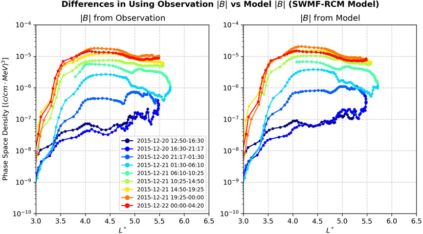 In Figure 2 we display a phase space density analysis with this step performed using a smoothing spline and a power law fit. For this experiment, options 2a, 3c, 4a, 5a, and 7a of Figure 1, were used and the background model was SWMF-RCM. In this example, use of the power law distribution for interpolating j(E) over a smoothing spline leads to very different conclusions regarding whether the event exhibits signatures of local acceleration (left) or radial transport (right). On the left panel, one can see a clear unimodal distribution whose peak increases in time, consistent with the local acceleration theory of (Boyd et al., 2018) energizing wave-particle acceleration occurring around L* ∼ 4.5 in this plot. While on the right, one can see the phase space density at high L* ∼ 5.5 remaining high and steady, while the phase space density at lower L* is gradually increasing consistent with radial transport acceleration (Elkington, 2006). Figure 3.
