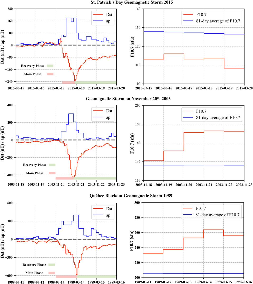 Figure 1. Temporal variations of space weather indices during the three most geomagnetically disturbed storms in solar cycles 22, 23, and 24. The left column shows geomagnetic indices (Dst and ap), while the right column presents solar activity (daily F10.7 flux and 81-day averages).