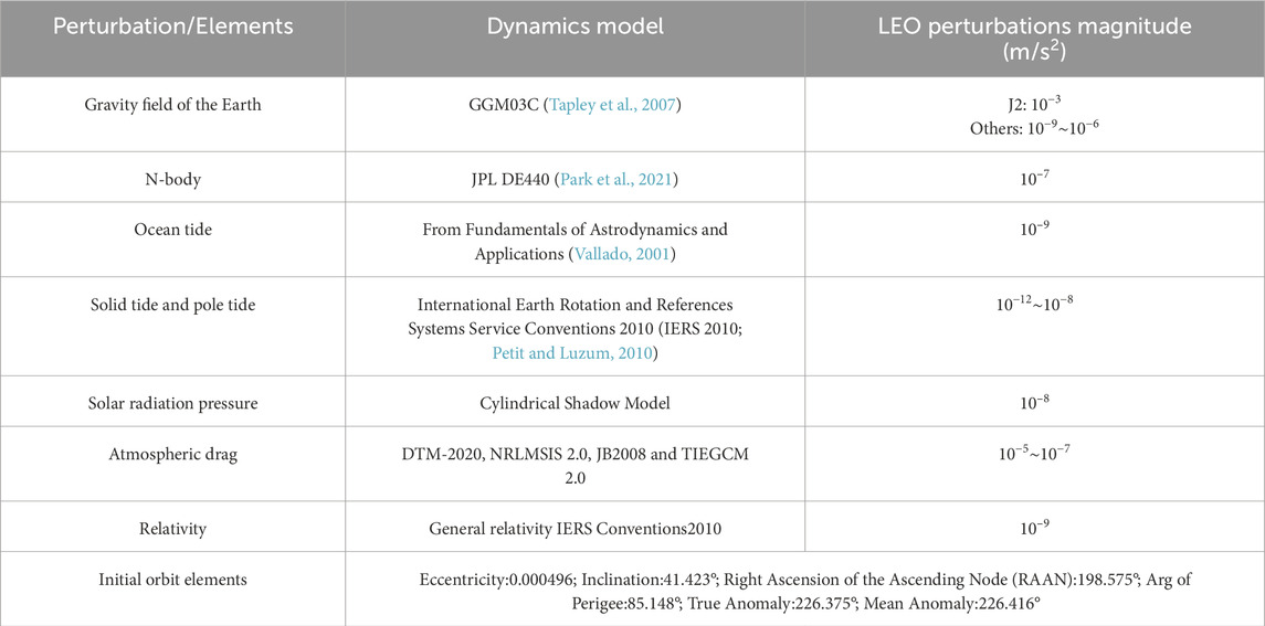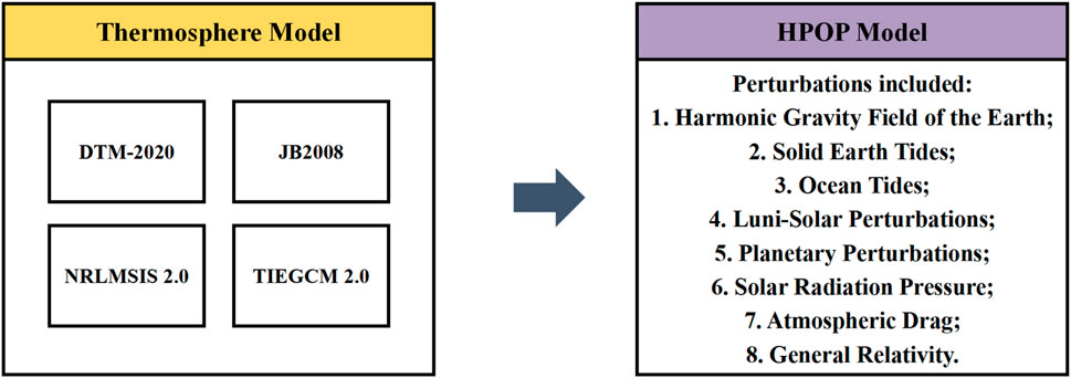 The thermospheric environment is a major factor influencing the prediction of spacecraft drag. In aerospace engineering, thermospheric models provide parameters such as density, temperature, and composition to predict aerodynamic drag on satellites and space debris (Oliveira and Zesta, 2019; Zhang et al., 2022). Thermospheric models developed in recent decades are broadly classified into two categories: first-principle physical models and empirical models (Bruinsma et al., 2021). Physical models solve the fluid equations numerically to describe the coupled ionosphere-thermosphere (IT) system (Ren and Lei, 2023). Empirical models, also known as statistical models, represent the statistically averaged behavior of the thermosphere using parameterized mathematical formulations. Several studies have investigated the application of thermospheric models to satellite orbits. Ya-Ying and Zhao (1995) analyzed the effects of various thermospheric models during periods of high and low solar activity on the orbital lifetime and propellant fuel consumption of a space station. Liu, (2015) adopted the Naval Research Laboratory Mass Spectrometer Incoherent Scatter Model (NRLMSIS) to reveal the correlation between the drag coefficient of Tiangong-1 and space environment parameters using wavelet transform analysis.
