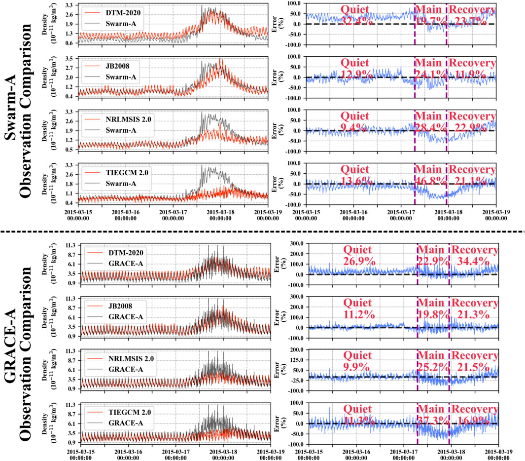 Figure 4. Comparison of the along-track density observed by satellites (Swarm-A and GRACE-A) and predicted by DTM-2020, JB 2008, NRLMSIS 2.0, and TIEGCM 2.0 models between March 15th and 19th, 2015.