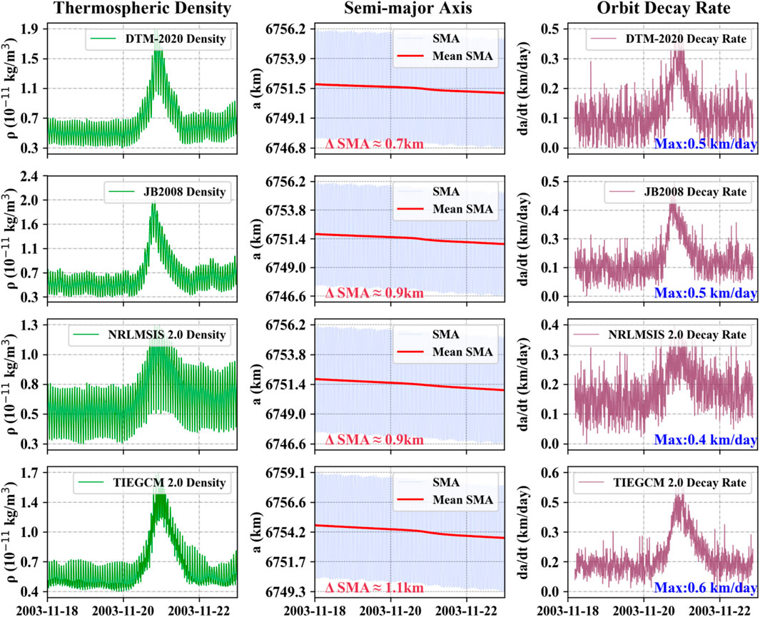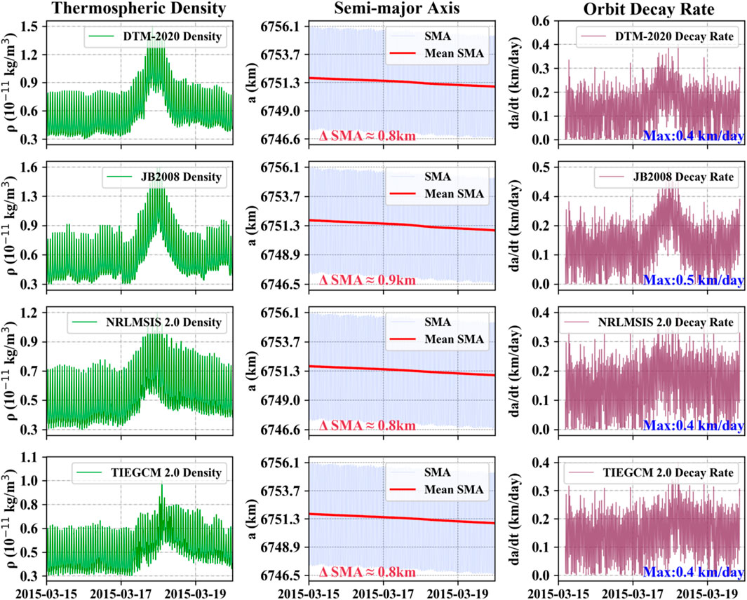 Figure 5 depicts the orbit decay of the CSS predicted by the HPOP model using different thermospheric models during the St. Patrick’s Day storm. The green lines in the first column represent the atmospheric density along the CSS trace for each model. The blue lines in the middle column depict the Semi-Major Axis (SMA). As the SMA exhibits oscillations, the EUK method is used to derive the mean SMA, which is represented by the red line. The total orbit decay over the 5-day period is shown in the second column, with values ranging from 0.8 km to 0.9 km between March 15th and 20th. The orbital decay rates (ODRs), shown in the third column as burgundy lines, were approximately 0.15 km/day during quiet conditions. During the main phase of the geomagnetic storm, the maximum ODR of the CSS increased to about 0.5 km/day, which is more than twice the rate observed during the quiet period.