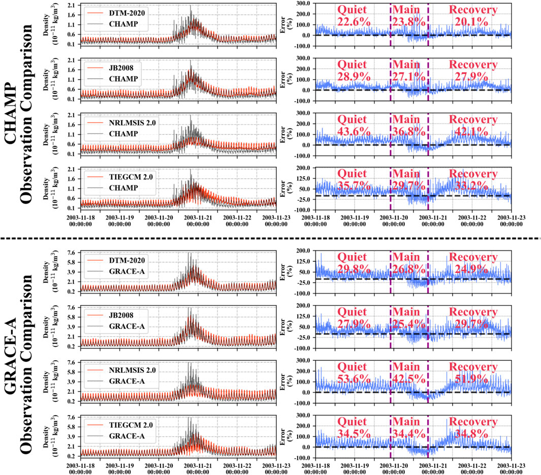 Figure 7 presents a comparative analysis of thermospheric density predictions from four atmospheric models (DTM-2020, JB 2008, NRLMSIS-2.0, and TIEGCM 2.0) against in situ measurements from the CHAMP and GRACE-A satellites during the November 2003 geomagnetic storm. At the CHAMP satellite altitude (380–410 km), all models show significant deviations during the storm’s quiet period, with NRLMSIS-2.0 and TIEGCM 2.0 showing particularly large mean biases (>35%). During the main phase, all models exhibit substantial errors reaching up to 200% in some cases, with error magnitudes comparable to those reported for JB2008 by Oliveira et al. (2020). Among these models, DTM-2020 and JB2008 demonstrate relatively better predictive performance, achieving mean errors of 23.8% and 27.1% respectively, while the other two models maintain consistently high error levels. Consistent with Oliveira et al. (2021) findings of JB2008s systematic underestimation (average 20%) during storm main phases, our results show DTM-2020 and JB2008 have relatively better performance (23.8% and 27.1% respectively). In the recovery phase, DTM-2020 and JB2008 retained their comparative advantage, though all models still exhibited errors exceeding 20%.