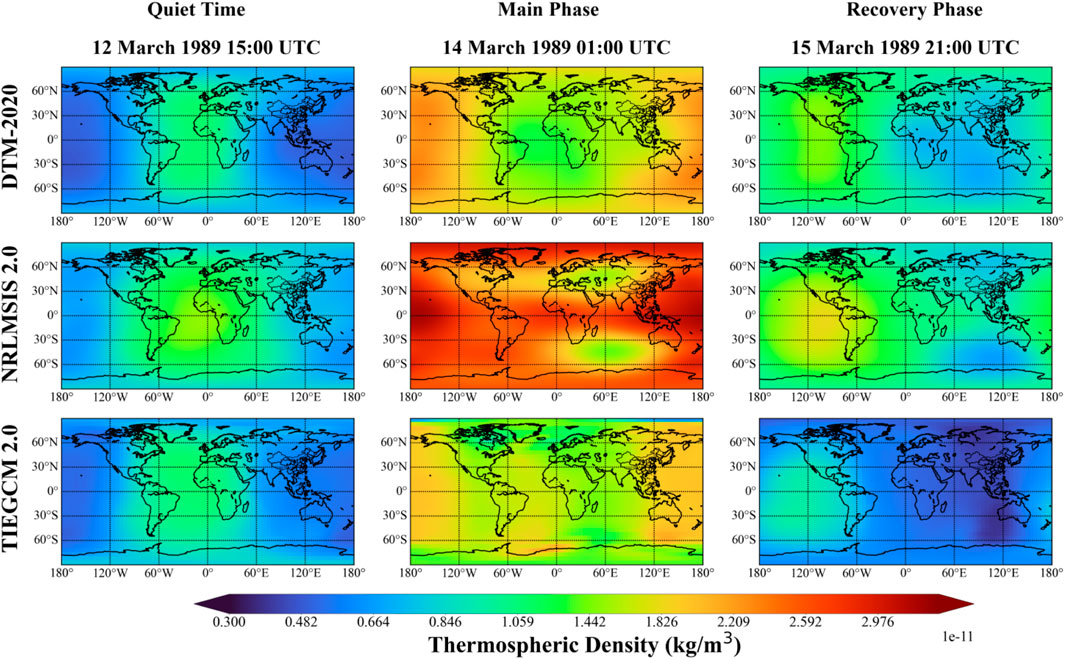 Figure 9. Global thermospheric density distributions at 400 km during the 11 March 1989 magnetic storm from different models. The rows correspond to DTM-2020 (top), NRLMSIS 2.0 (second), and TIEGCM 2.0 (bottom), shown across the quiet, main, and recovery phases.
