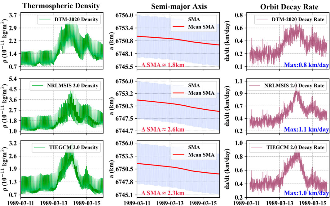 Figure 10. Orbital decay of the Chinese Space Station from March 11th to 16th, 1989, predicted by the HPOP using neutral densities from different thermospheric models (DTM-2020, NRLMSIS 2.0, and TIEGCM 2.0). The left column shows the along-track densities from each model, the middle column presents the SMA and its mean variations under each model, and the right column displays the corresponding decay rates predicted by the respective models.
