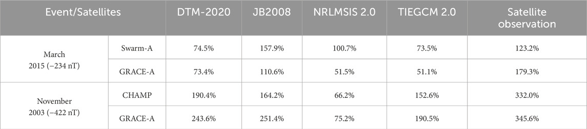 In this study, various thermospheric models are used to estimate the neutral density during the most intense storm events in the previous three solar cycles including the DTM-2020, JB 2008, NRLMSIS 2.0 and TIEGCM 2.0 models. Table 2 shows the storm enhancement in different thermospheric models compared with Swarm, CHAMP, and GRACE observations. The results indicate that the JB2008 model outperforms other models in reproducing thermospheric density enhancements during the extreme magnetic storms of 2003 and 2015. Model error comparisons in Figures 4, 7, based on Swarm, GRACE and CHAMP satellite observations, show that DTM-2020 and JB2008 provides the best peak density simulation for the 2015 and 2003 events. Other models tend to underestimate peak values, which is consistent with the conclusions of Bruinsma and Laurens (2024).