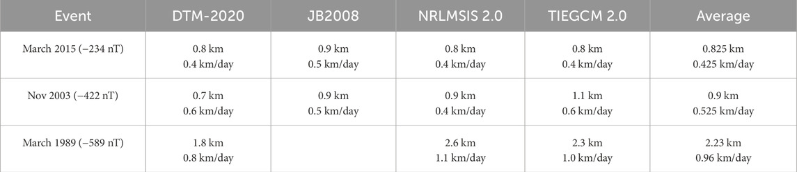 DTM-2020 performs better in estimating peak densities during extreme events. It is worth noting that the DTM limits the maximum ap60 input to 657. In the 1989 event, ap60 exceeded the DTM-2020 model’s limit of 657, reaching 705, which caused DTM to underestimate density changes relative to other models. Therefore, extra caution should be exercised when using DTM for future extreme storm events.