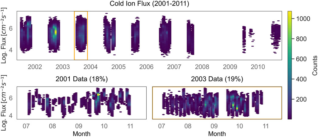 Figure 1. Number of cold ion flux observations versus flux and time for the period from 2001 to 2011 (top). Zoom-ins for 2001 and 2003 show periods selected as best candidates for test data (bottom). The orange rectangle indicates the selected test dataset. See more details about the selection in Section 3.