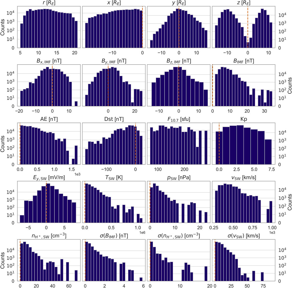 Table 1 lists the predictors evaluated for their relevance to model performance. Histograms for the predictors are shown in Figure 2. The numbers of events in the histograms generally represent the full range of parameter values in the dataset, with only a few outliers towards high solar wind and geomagnetic activity.