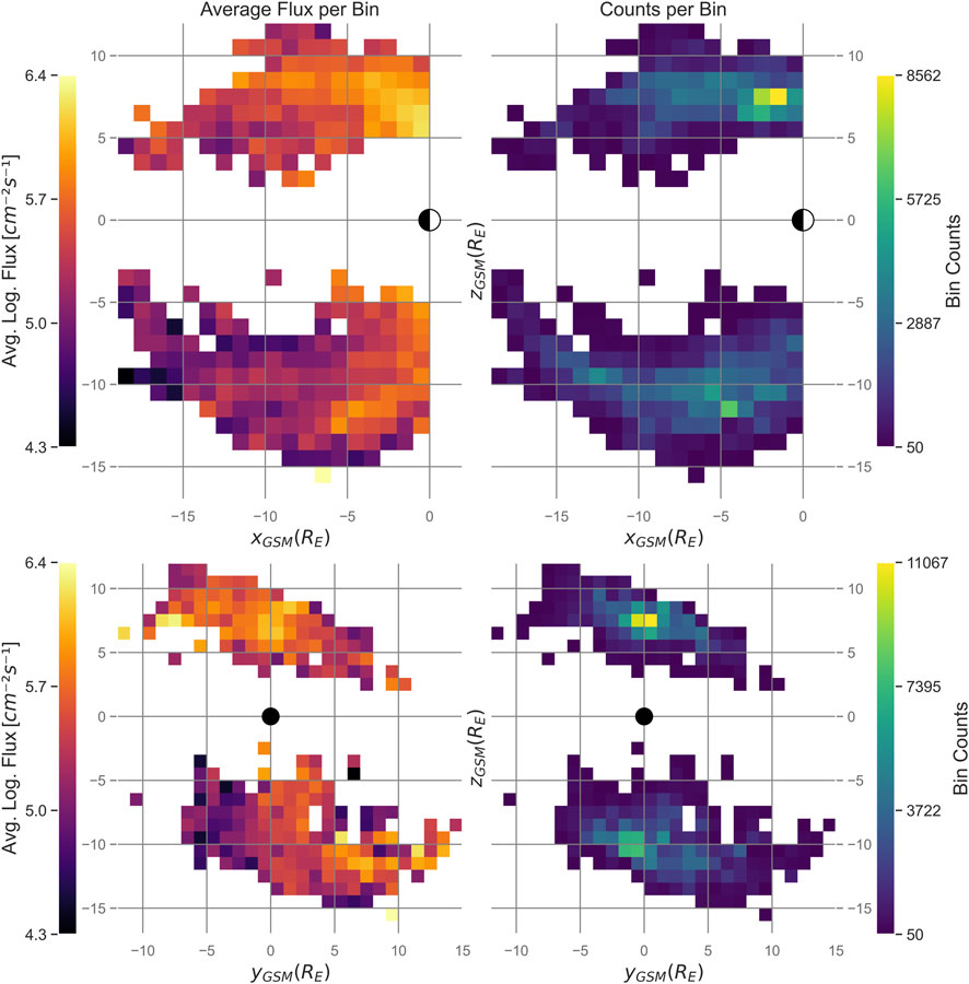 Figure 3. The heatmaps illustrate the spatial distribution of the average logarithmic cold ion flux- (left column) and the counts of data points per bin (right column) in the xz (top) and yz (bottom) GSM planes. The Earth is shown as a circle, where the white half corresponds to the day side and the black half to the night side. Only bins with minimum 20 data points are shown. The bin size is