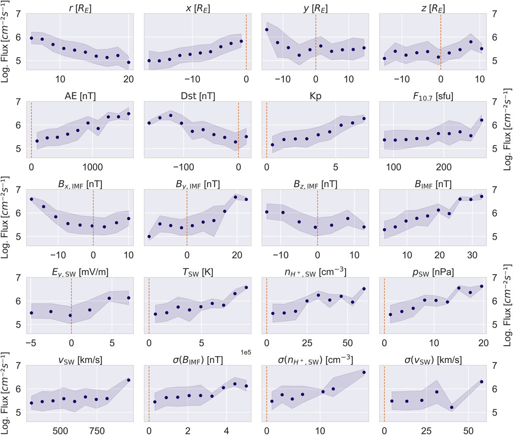 Figure 4. Relationships between the mean cold ion flux and the predictors listed in Table 1. The original range of values for each parameter is divided into 10 bins. The mean flux is computed within each bin, provided that the number of data points in the bin exceeds a minimum threshold of 20. The transparent blue regions represent the interquartile range (IQR), defined as the range between the 25th and 75th percentiles of the flux values within each bin. Orange vertical lines indicate the zero crossing on the x-axis.