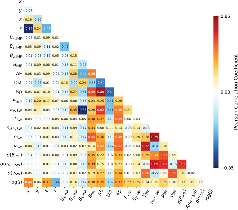 Figure 5. The matrix shows the Pearson correlation coefficients between potential predictors and cold ion flux,