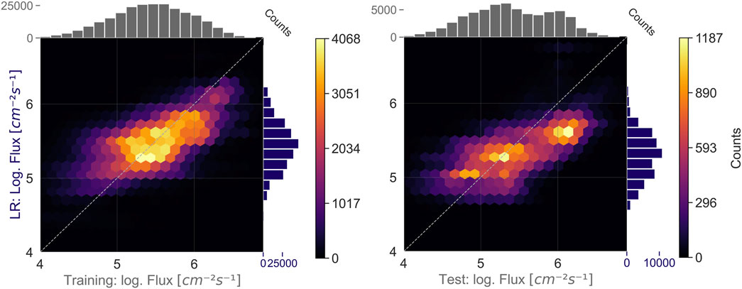 Figure 6. Comparison of measured and LR model predicted cold ion flux, for both training and test datasets. The color bars represent the number of flux values within each bin shown in the plots. The marginal histograms show the distribution of the flux values for both the predicted (vertical) and observed (horizontal) data. A good model predicts most of the fluxes along the white dashed diagonal, namely, closely matching the measurements.