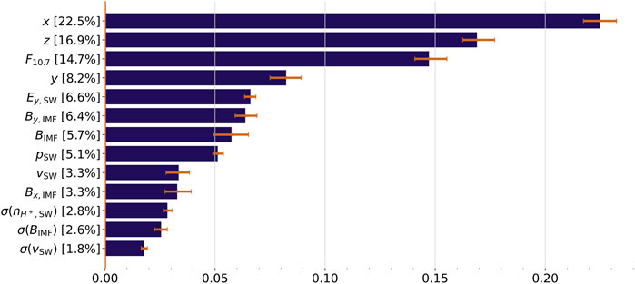 Figure 8. ETR model feature importance values. The length of the orange error bars corresponds to 95% confidence intervals.