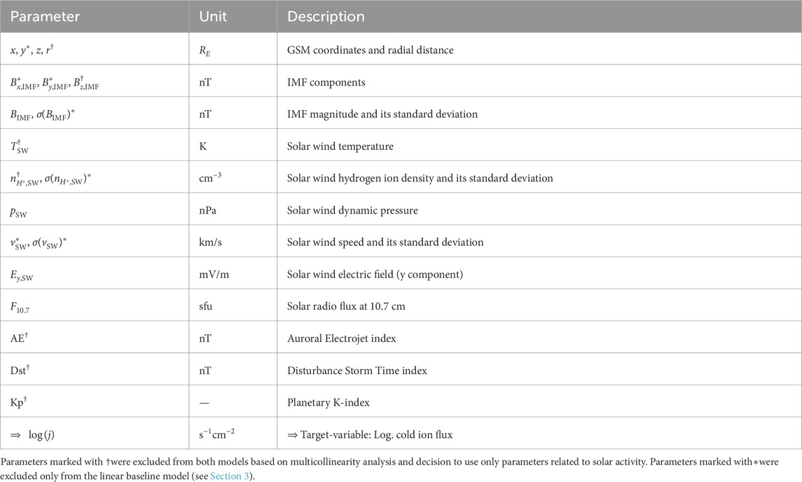 Our goal is to model the outflow based on causal drivers of Sun–Earth interaction (e.g., solar wind parameters) rather than indices of geomagnetic activity, which represent coupled magnetosphere–ionosphere system responses and may both influence and be influenced by ion outflow. This approach also makes it easier or even possible to apply our results to other planets where magnetic activity cannot yet be measured at the surface. We tried LR and ETR models with geomagnetic parameters, but their performance on the training dataset was not significantly better than that of the model driven just by solar parameters.