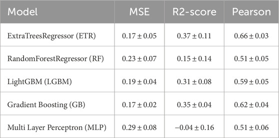 To determine the best performing model for cold ion flux, we evaluate five different ML methods other than linear regression: Extra-Trees Regressor (ETR) (Geurts et al., 2006), Random Forest (Breiman, 2001), Gradient Boosting (Friedman, 2001), Light Gradient Boosting (Ke et al., 2017) (all four ensemble models), and Multi Layer Perceptron (Rumelhart et al., 1986) (neural network). Here we use the models by default settings in combination with the KFold CV. Table 2 presents the CV results obtained for each evaluated model. Among the models, ETR consistently demonstrates the lowest mean CV-MSE (0.17) and the highest Pearson correlation coefficient (66%). Other models exhibit higher mean CV-MSE and lower correlation. Given these results, we select the ETR method to derive a non-linear model for the cold ion flux.