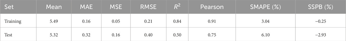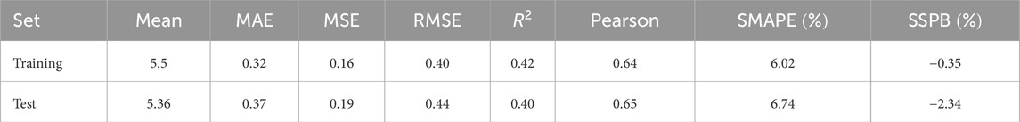 To derive a predictive formula which can be used with unscaled input data, the model is retrained using the final set of unscaled features. The performance is evaluated on the test dataset from 2003. The corresponding metrics are provided in Table 3 and discussed in Section 4.1.