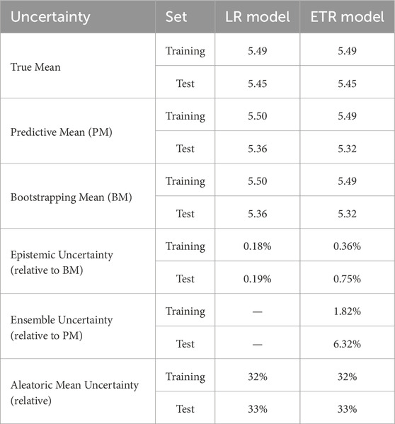As shown in Table 5, the ETR model exhibits slightly higher epistemic uncertainty estimates than the LR model. This is expected because fully deterministic models, such as LR, account less for the variability inherent in the data. Ensemble models such as ETR aggregate multiple estimators and, therefore, capture a wider range of possible values. Additionally, the ensemble uncertainties in the ETR model are higher than the epistemic uncertainties estimated through bootstrapping. This indicates that the variability introduced by combining diverse predictors in the ensemble contributes to the overall uncertainty. However, the aleatoric uncertainty is the highest, if comparing it with epistemic and ensemble uncertainties.