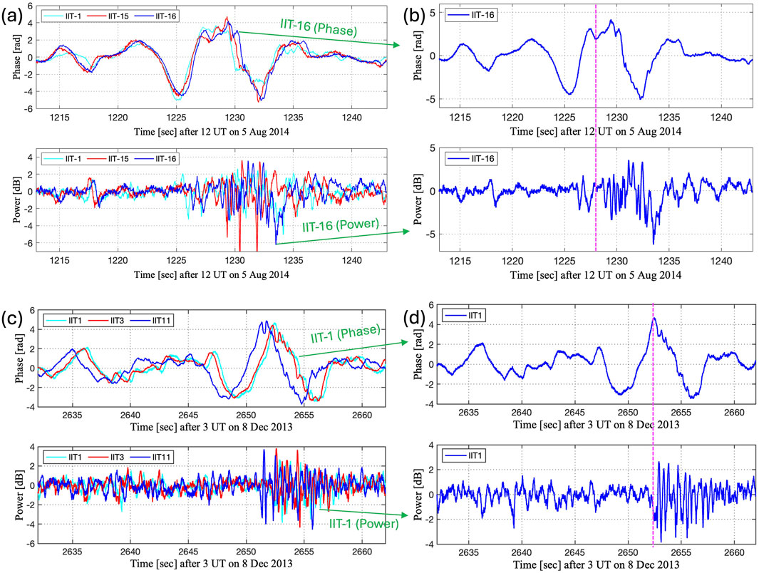 Figure 1. The phase and power fluctuations recorded by SAGA receivers on 5 August 2014 and 8 December 2013. Panels (a,c) data recorded at multiple SAGA IIT receivers. Panels (b,d) focus on IIT-16 and IIT-1 respectively. The magenta dashed line highlights the onset of high-frequency components within the signal phase that coincide with intense power fluctuations.